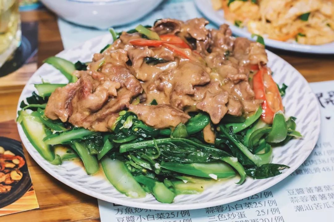 潮汕的芥兰牛肉与广州的有所不同,这里的牛肉专门用沙茶酱翻炒过,别有一道风味。